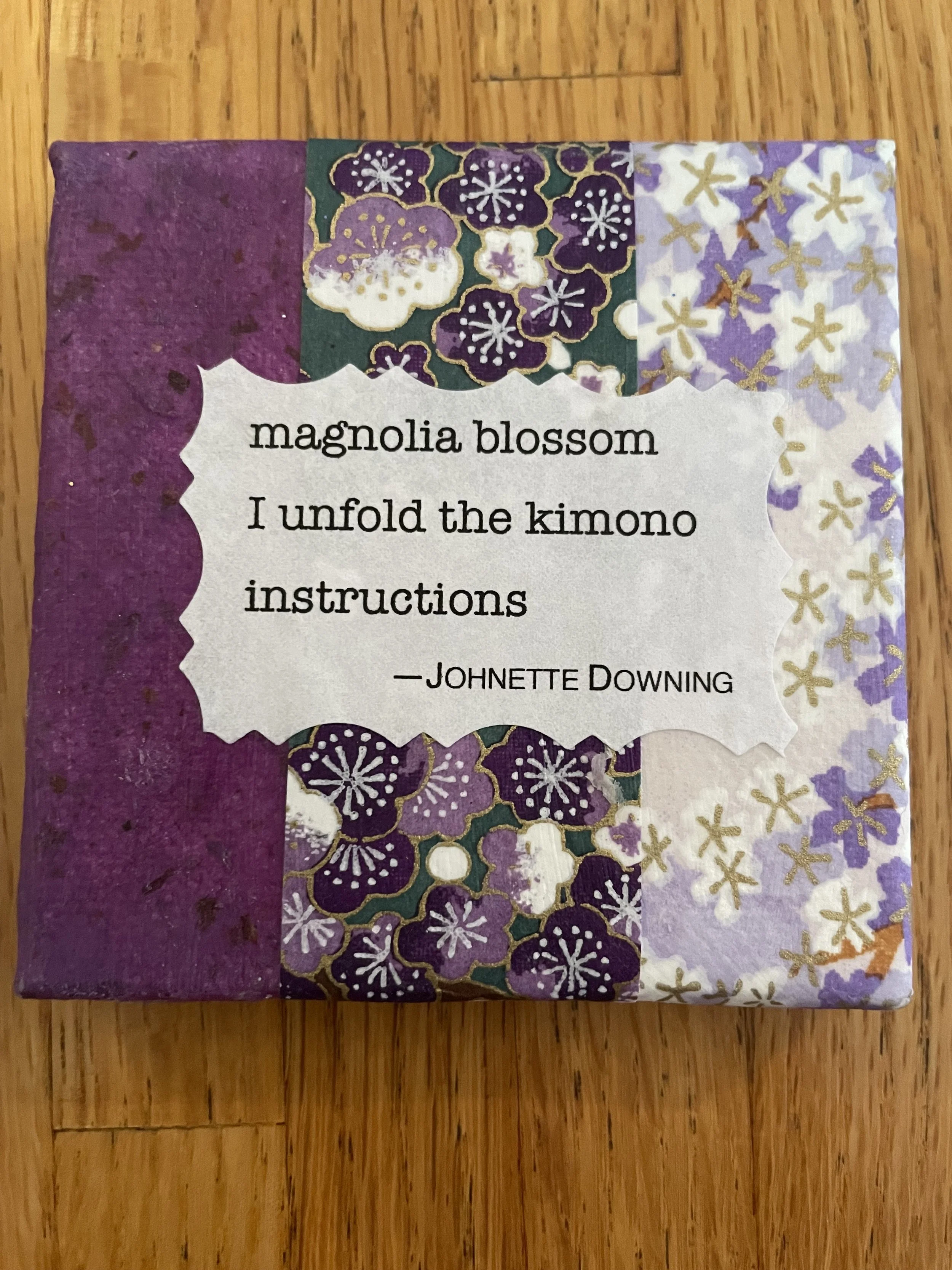 I began playing around with cut-paper collage in 1990 to illustrate my poetry, songs and children’s books. Recently, I created what I call “haiku boxes,” haiku and cut-paper collage on canvas frames, as well as broadsides and a chapbook using haiku and photography. The possibilities are endless.
